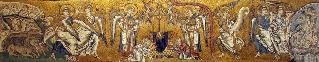En uno de los mosaicos del Día del Juicio en Torcello encontramos que los ángeles llaman mediante sus trompetas y los animales –leones, pájaros, entre otros– resucitan y responden el llamado expulsando íntegros a los hombres que habían devorado. Así como Dios puede crear ex nihilo, también puede resucitar la carne ex nihilo. Hay aquí una imagen reconciliada del vínculo entre lo humano y el animal. Lo mismo sucede con la tierra y el mar.
